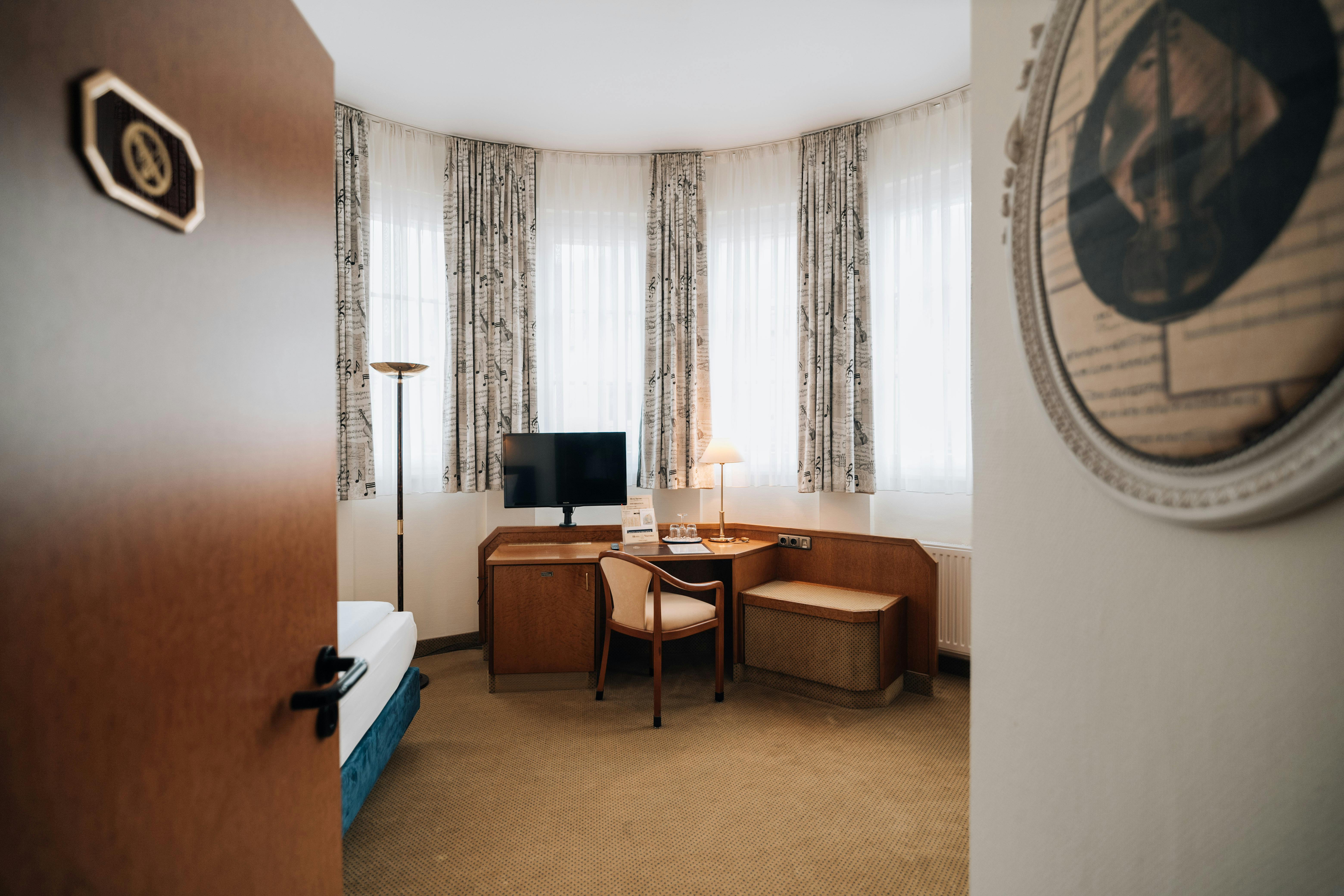 Single room, embedded in a bay window, window fronts all round with plenty of daylight. Selected, harmoniously coordinated decorations and pictures ensure your well-being and bring the historical and musical history to life. Bay windows named after various composers.