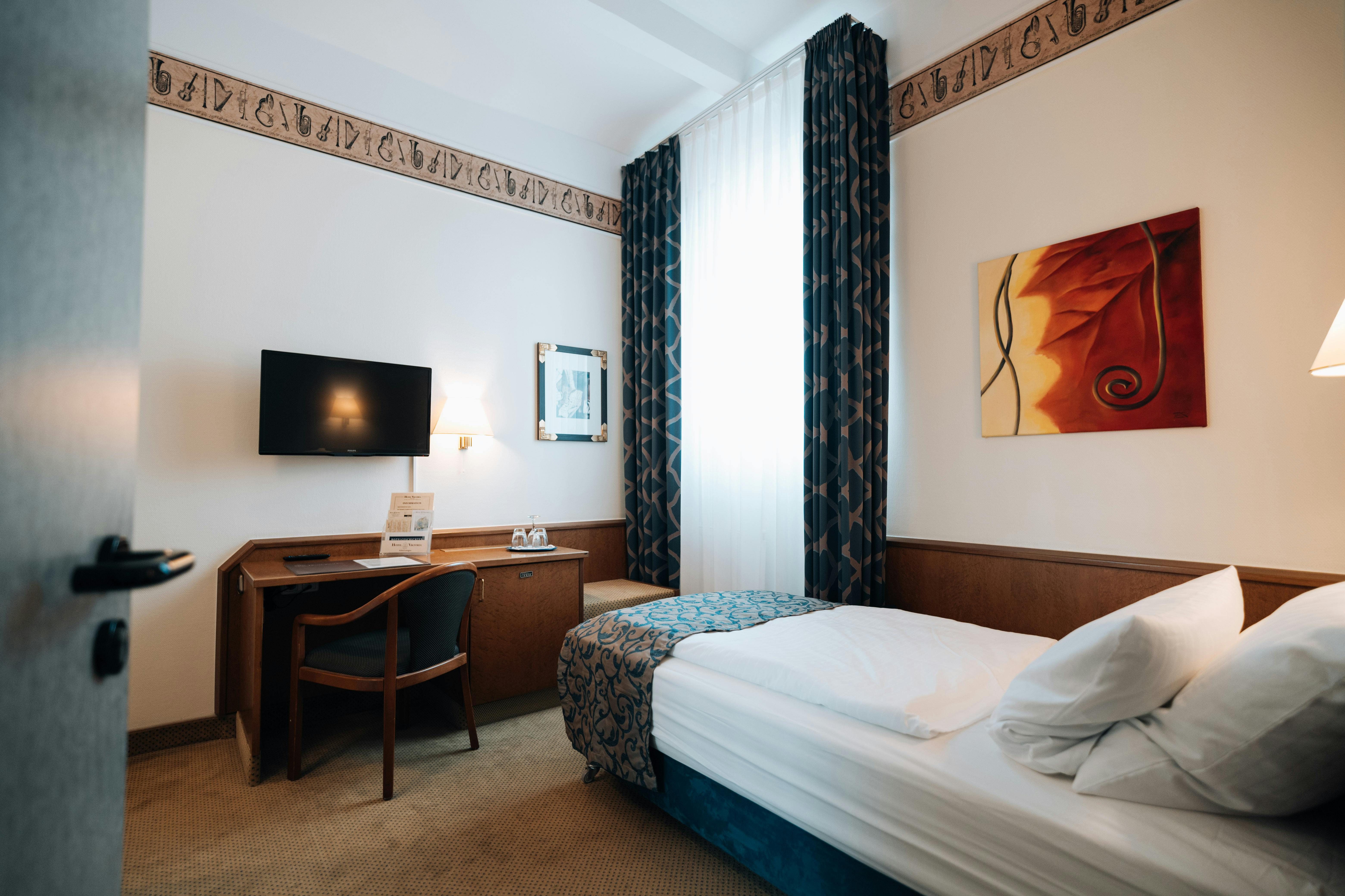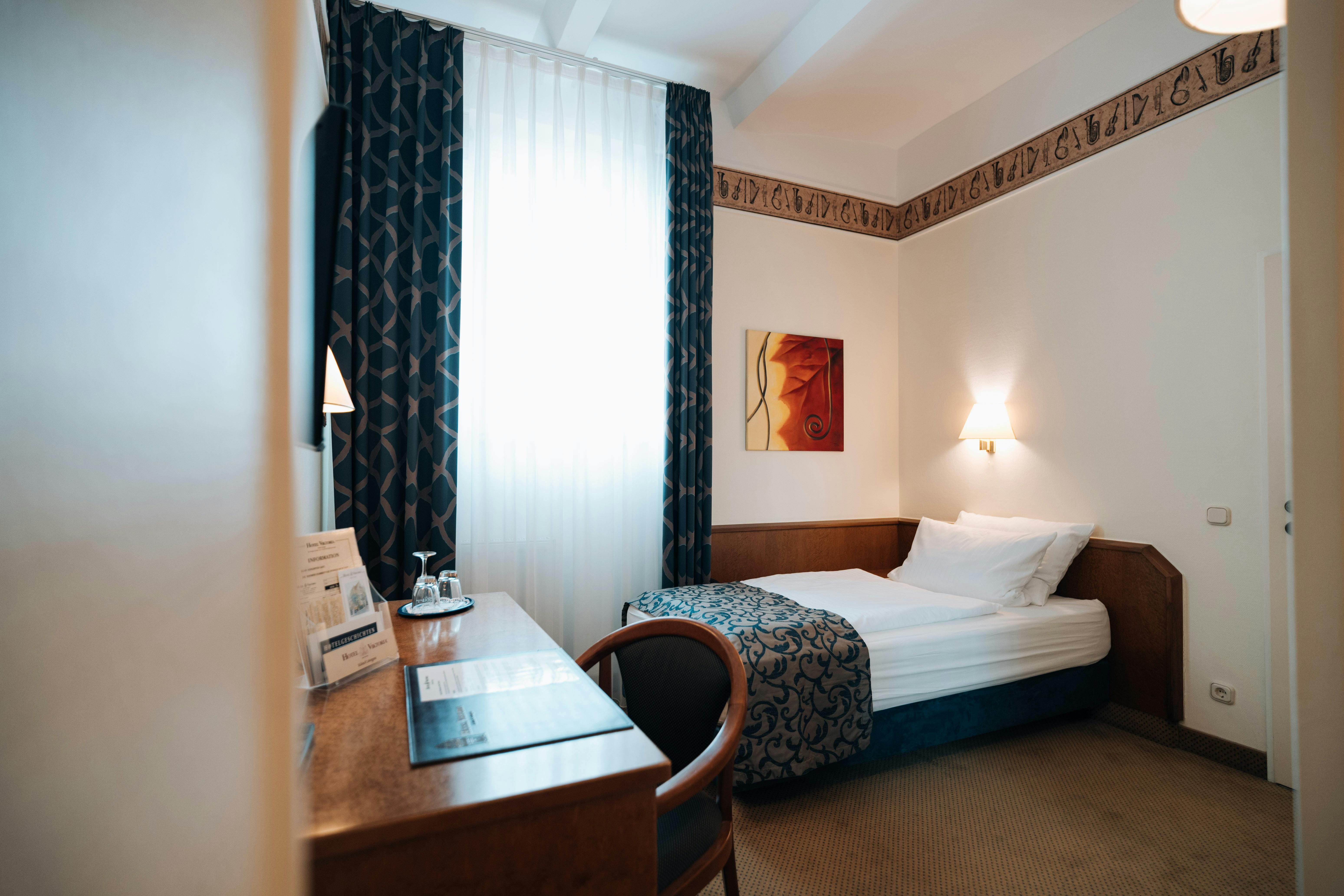 Small but cosy and bright single room to make you feel at home! Box spring bed with high comfort mattress 100cm x 200cm free WLAN desk with plenty of space safe international TV channels stocked minibar (contents for a fee) welcome tray with kettle, free tea/coffee